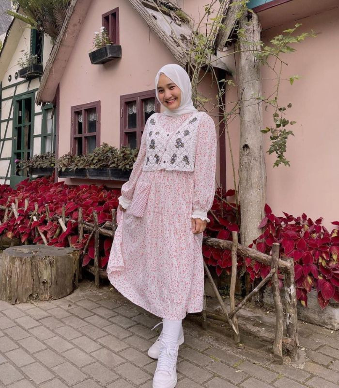 10. Terakhir, outfit yang memberikan kesan anggun yang menawan! Fatin menggabungkan dress bermotif floral dibalut knit vest berwarna serba putih yang senada dengan hijab pashmina serta legging pants dan sneakers. Terlihat gayanya seperti ala eonnie Korea yang bisa banget Anda tiru!