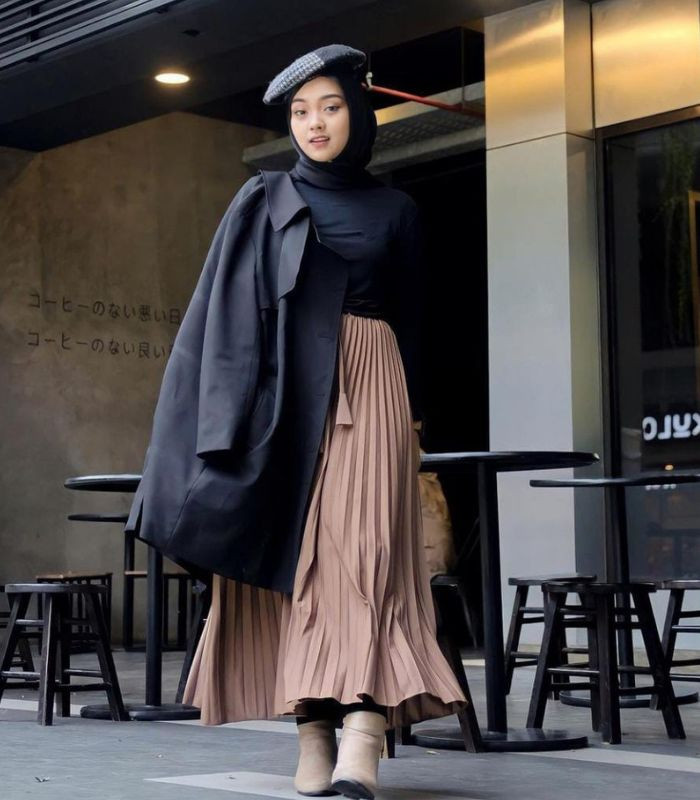 2. Tampil elegan look yang memberikan kesan chic. Ia menggabungkan basic long sleeve t-shirt, hijab pashmina serta long blazer berwarna serba hitam dipadankan dengan rok plisket berwarna coksu, tambahkan baret hat dan ankle boot bikin penampilan jadi makin all out!