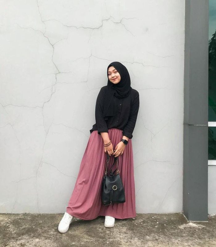 3. Sufu memadukan oversized shirt dengan hijab pashmina berwarna hitam senada dipadankan dengan rok plisket berwarna bright purple, terkesan simple namun tetap terlihat effortless yang modis!