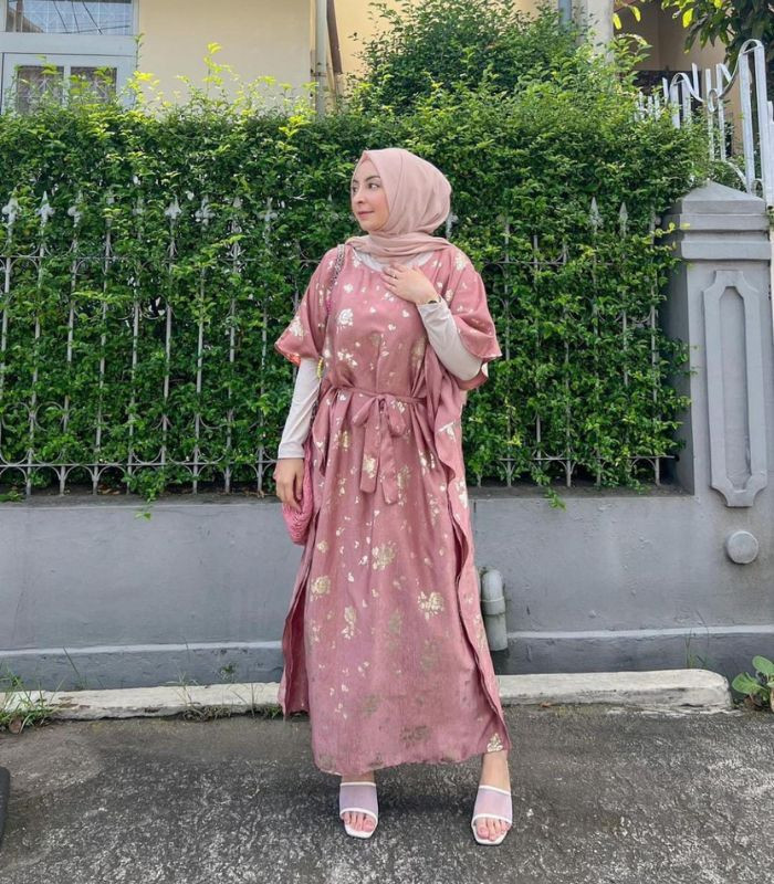 6. Tampil feminin look yang memberikan kesan cute abis! Nabila menggabungkan manset warna blush dibalut dengan kaftan warna pink bermotif floral dipadankan dengan hijab pashmina berwarna baby pink.