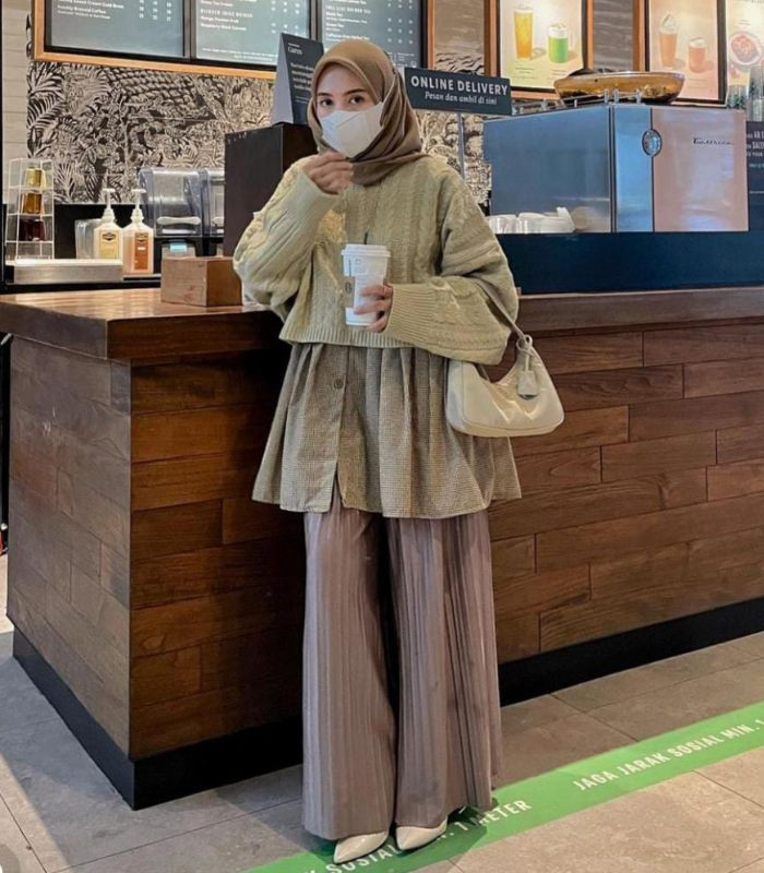 2. Nisa memadukan oversized linen shirt berwarna grey brown dibalut dengan sweater knit cropped top berwarna sand beige dipadankan dengan celana kulot plisket berwarna rosey brown dan tak lupa ia memilih hijab segi empat berwarna coffee.