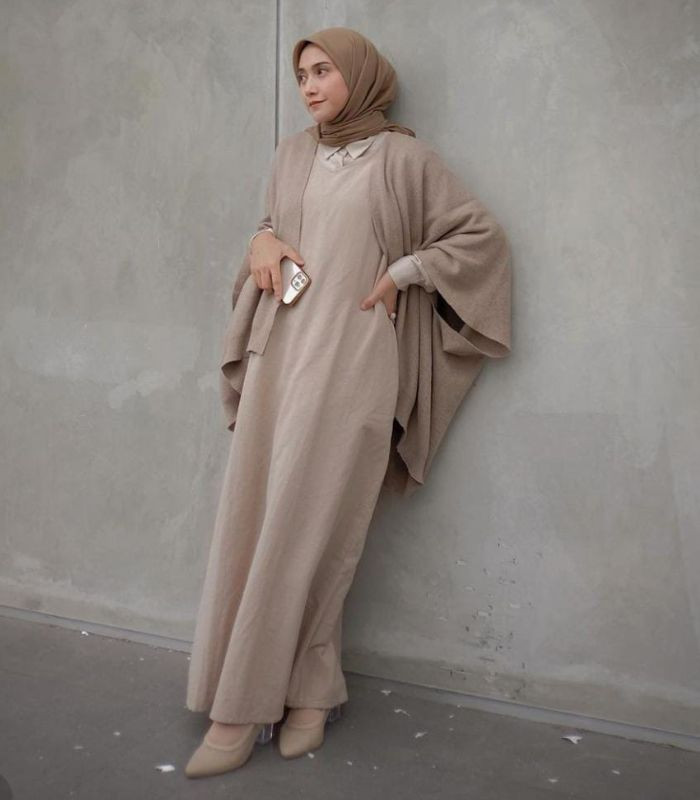 3. Mengusung konsep teknik layering style dengan nuansa warna beige. Ia menggabungkan kemeja lengan panjang dibalut dress warna nude beige dan cardigan outer warna soft nude dijadikan sebagai outwear, dikombinasikan dengan hijab segi empat berwarna dark tan. Tambahkan block heels berwarna nude senada agar tampilanmu makin all out!