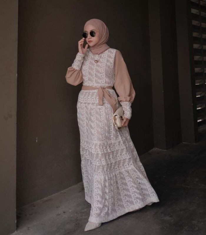 4. Memberikan kesan softgirl bernuansa nude kalem yang manis. Nisa memilih dress berwarna putih dengan aksen motif batik serta kombinasi warna soft beige dibagian tangan yang senada dengan hijab pashmina, ia menggunakan sunglasses, hand bag dan block heels agar tampilannya makin terlihat modis kekinian!