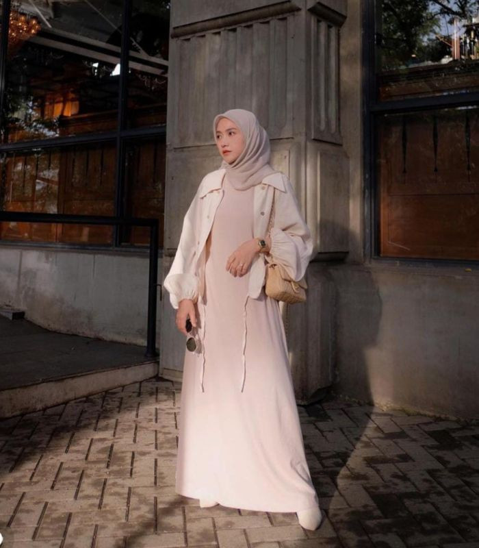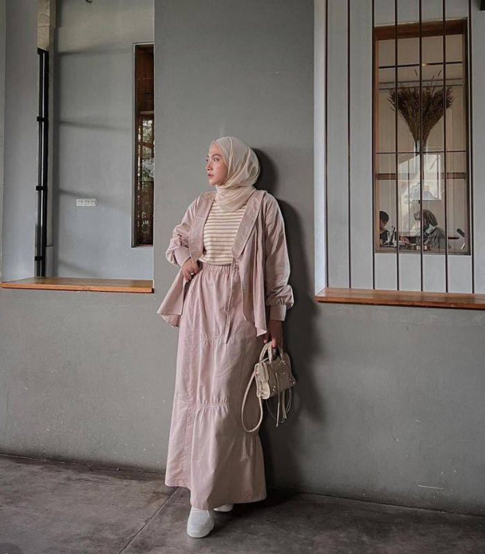 6. Tampil stylish dengan menggunakan striped long sleeve t-shirt berwarna cream beige yang senada dengan hijab pashmina dibalut setelan blazer linen shirt dan maxi skirt berwarna baby pink yang senada. Outfit yang cocok dikenakan untuk kuliah dan hangout.