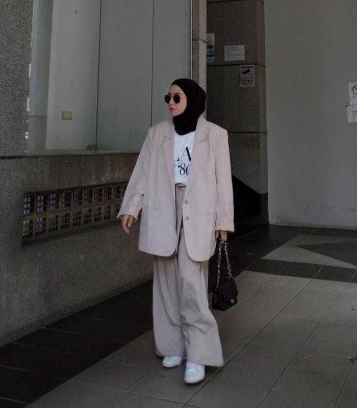 7. Terkesan elegan yang tampil trendy abis! Nisa memadukan inner putih dibalut dengan setelan oversized blazer dan high waist wide leg pants berwarna beige senada dipadankan dengan hijab pashmina hitam, ia memakai sunglasses dan hand bag berwarna hitam senada agar tampilannya makin all out!