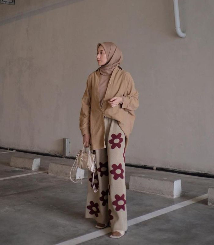 8. Mengusung konsep bernuansa warna netral yang kalem. Ia menggabungkan long sleeve t-shirt warna rosey brown dibalut oversized shirt berwarna medium tan dipadankan dengan knit cullote pants warna beige bermotif floral serta hijab segi empat berwarna coffee.