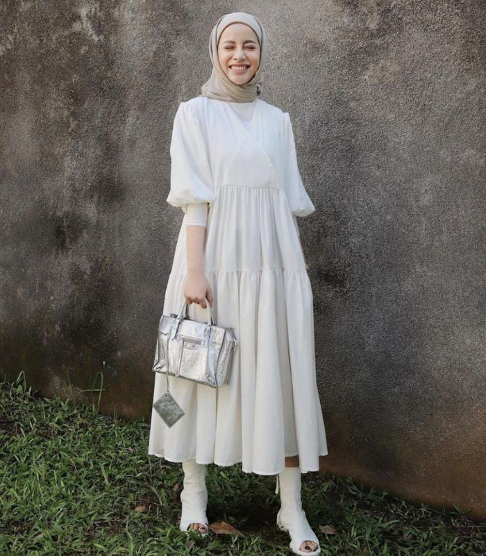 2. Tampil softgirl yang memberikan kesan feminin look. Aghnia memadukan inner dibalut midi dress berwarna putih serta tak lupa ia memilih hijab pashmina berwarna soft beige, agar penampilannya makin terlihat all out ia mengenakan hand bag warna silver dan tall shoes putih yang tampak matching.