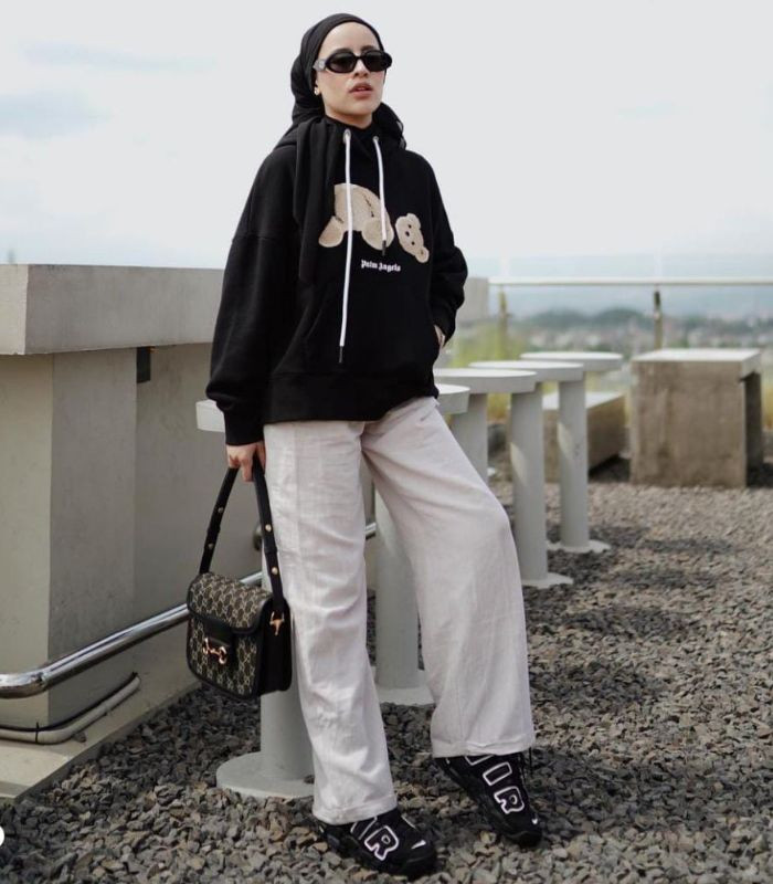 3. Terkesan simple namun tetap terlihat effortless yang kece abis! Ia menggabungkan hoddie dan hijab pashmina berwarna hitam senada dipadankan dengan celana kulot berwarna ivory, tambahkan sunglasses, hand bag dan sneakers berwarna hitam senada. Bikin penampilannya makin standout!