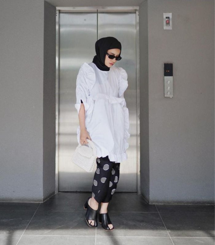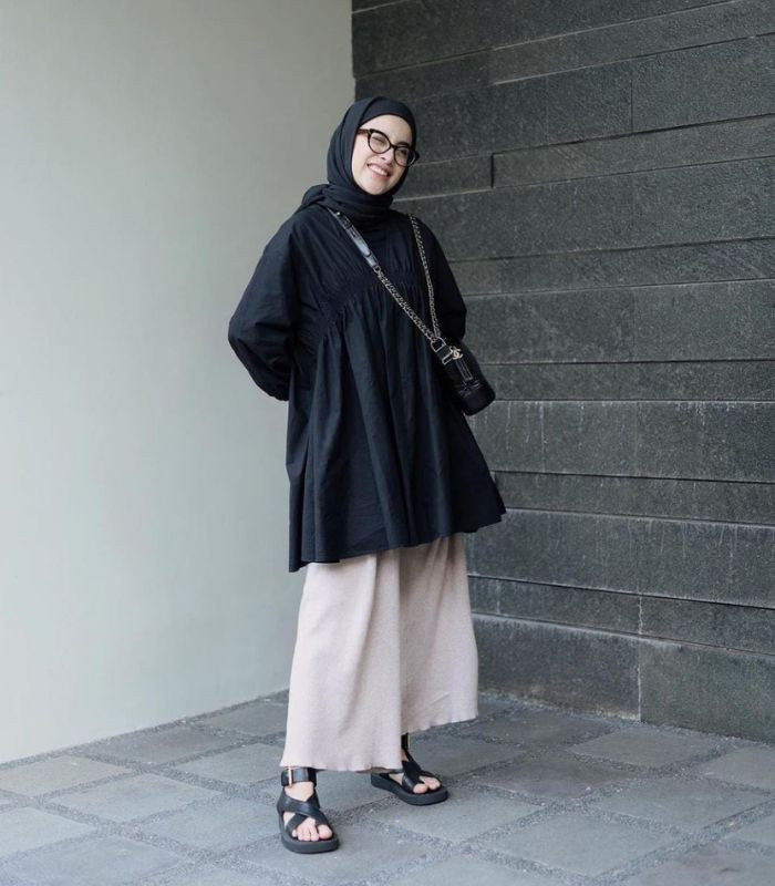 6. Outfit yang cocok dikenakan untuk kuliah ataupun hangout santai. Aghnia mengombinasikan oversized blouse berwarna hitam senada dengan hijab pashmina dipadankan dengan celana kulot berwarna ivory, ia melengkapi outfit dengan sling bag dan strap sandals berwarna senada.