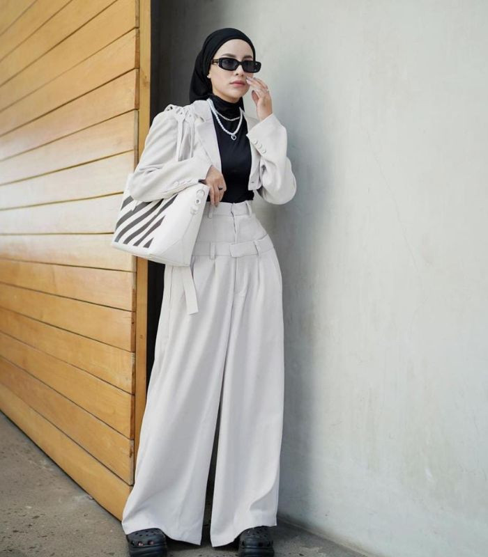 7. Tampil outfit styling dengan memadukan inner turtle neck hitam yang senada dengan hijab pashmina dibalut cropped top cardigan dan high waist wide leg pants berwarna putih senada. Ia memberikan statement point aksesori kalung sebagai pemanis outfit-nya.
