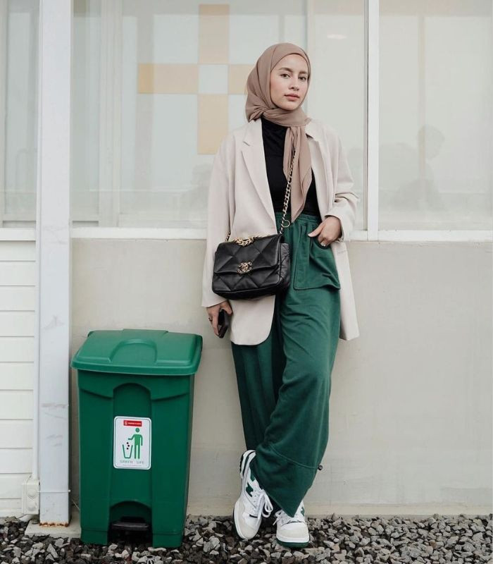 8. Penampilan yang beda memberikan kesan colorful namun tetap terlihat stylish. Aghnia memadukan long sleeve t-shirt hitam dibalut blazer warna ivory dengan celana kulot berwarna green bottle beraksen pocket di luar serta hijab pashmina warna latte. Tambahkan sling bag dan sneakers favoritmu!