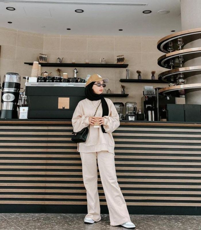 2. Tampil simple namun tetap terlihat effortless yang nyaman dikenakan seharian! Pilih setelan sweatshirt dan high waist loose pants berwarna cream senada dipadankan dengan hijab pashmina warna hitam, berikan statement point pada outfit dengan mengenakan baseball cap, sunglasses, sling bag, dan sneakers. Bikin penampilanmu jadi lebih modis!