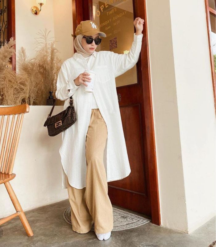 3. Padukan inner putih dibalut dress shirt berwarna senada dengan high waist loose pants berwarna cream serta hijab pashmina warna soft beige, gunakan baseball cap dan sunglasses agar outfit-mu makin terlihat standout yang kekinian!