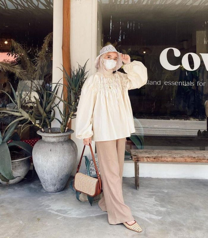 4. Mix oversized blouse berwarna sand beige match dengan high waist loose pants berwarna beige serta hijab pashmina berwarna soft beige, tambahkan bucket hat bermotif, hand bag dan flat shoes dengan model yang senada. Bikin penampilanmu terkesan nude kalem yang terlihat manis!