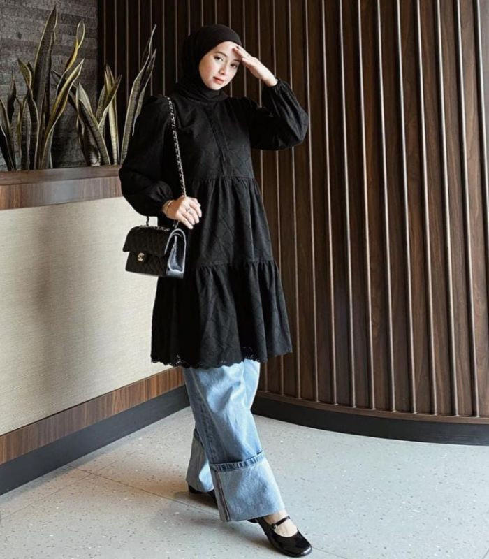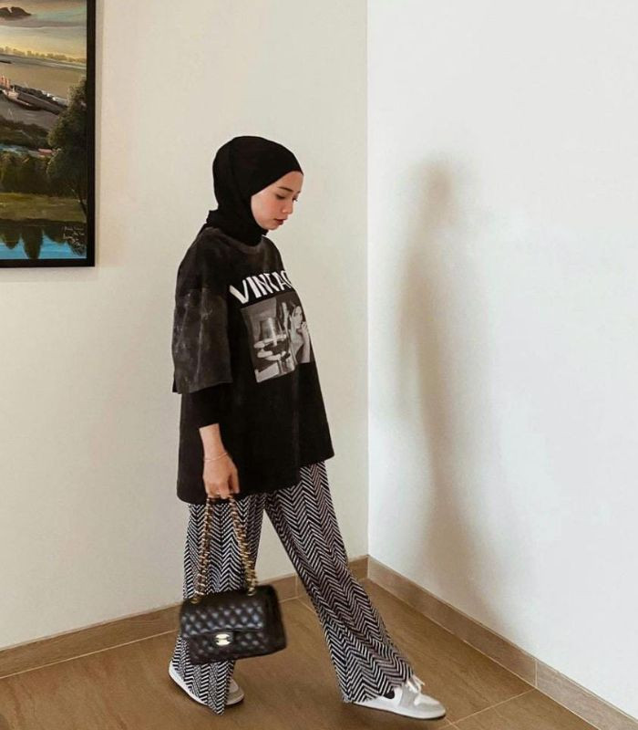 7. Pilih manset sebagai dalamannya dibalut oversized t-shirt bergambar dan hijab pashmina berwarna serba hitam dipadukan dengan high waist loose pants bermotif, tambahkan hand bag dan sneakers andalanmu agar penampilan makin terlihat kece abis!
