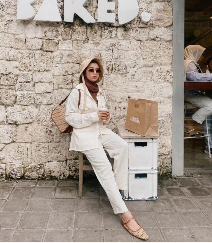 6. Tampil stylish dengan memadukan inner coklat yang senada dengan hijab pashmina dibalut dengan one set oversized shirt dan straight pants berwarna ivory senada, tak lupa Linda menambahkan bucket hat, sunglasses, hand bag dan strap flat shoes bermodel senada agar tampilannya makin all out!