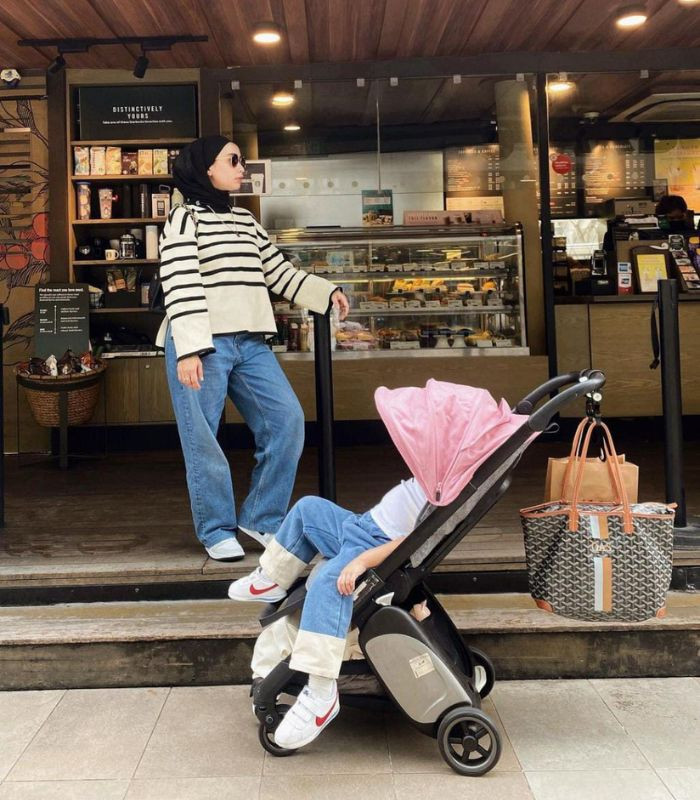 8. Terkesan simple namun tetap terlihat effortless yang cocok dikenakan untuk jalan-jalan seharian! Linda memadukan knit striped long sleeve t-shirt warna putih dengan high waist loose jeans serta hijab pashmina berwarna hitam senada, tak lupa ia menggunakan sunglasses dan sneakers agar tampilannya makin terlihat modis!
