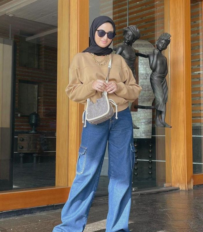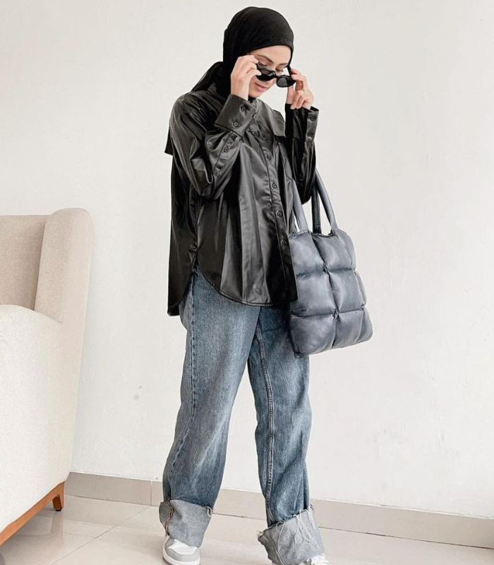 3. Perpaduan oversized leather shirt dan hijab pashmina berwarna hitam senada dipadankan dengan cuffed jeans, bikin OOTD-mu terlihat makin kece maksimal dengan konsep grunge style yang bisa Anda coba gaya ini!