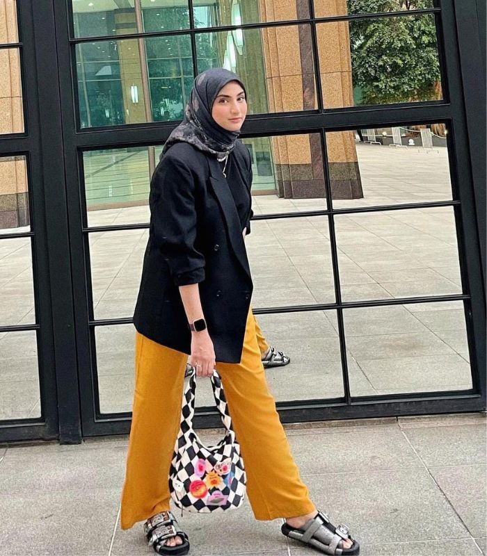 4. Penampilan yang memberikan kesan elegan yang terlihat chic. Mira memilih inner dibalut blazer berwarna hitam senada dikombinasikan dengan high waist loose pants berwarna kuning mustard dan tak lupa ia mengenakan hijab segi empat printing berwarna hitam. Tambahkan hand bag dan slip on sandals andalanmu, ya!