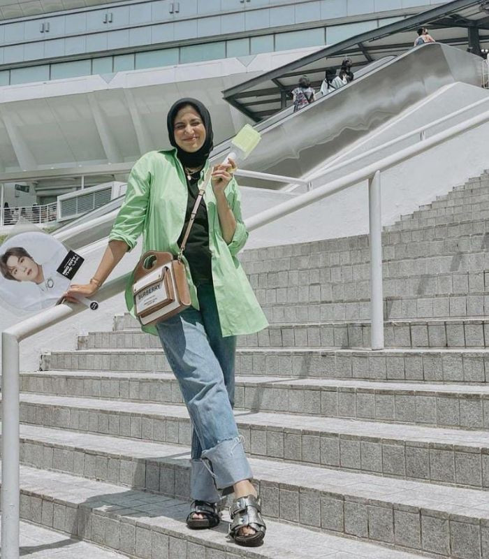 5. Tampil fresh look yang kekinian. Padukan inner hitam yang senada dengan hijab segi empat dibalut oversized shirt berwarna mint green dipadankan dengan cuffed jeans, lengkapi outfit dengan sling bag dan slip on sandals agar outfit-mu makin terlihatĀ standout yang kece abis!