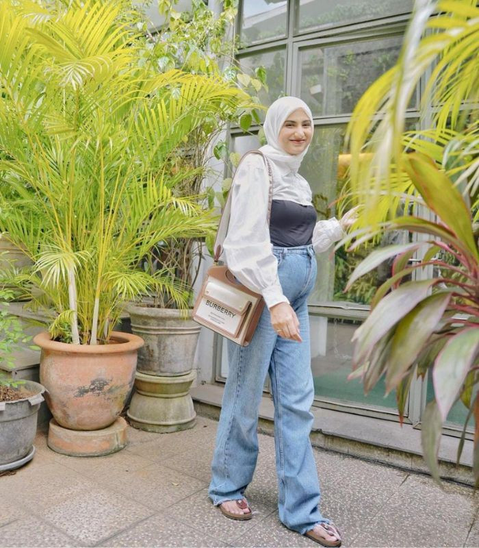 6. Outfit yang terkesan gaya casual cocok juga dikenakan untuk hangout santai. Perpaduan oversized shirt putih yang senada dengan hijab segi empat dipadankan dengan high waist loose jeans, tambahkan sling bag dan sandals warna senada agar outfit-mu tampak matching!