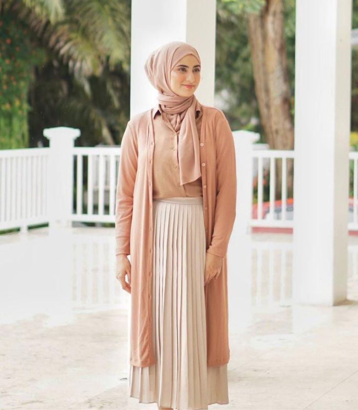 7. Mengusung konsep layering style yang tampil feminin look banget! Mira menggabungkan long sleeve shirt berwarna rosey brown dibalut long knit outer cardigan berwarna peach pink dan rok plisket berwarna cream beige serta hijab pashmina berwarna dusty pink.