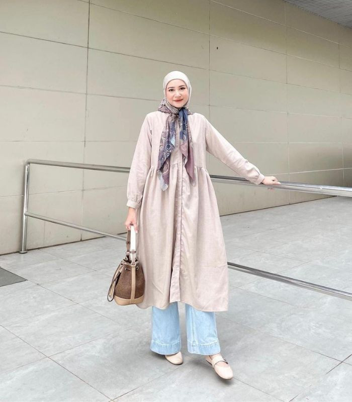 1. Perpaduan oversized midi dress berwarna cream beige dengan celana jeans serta hijab segi empat printing berwarna nude, tambahkan hand bag dan strap shoes andalan. Bikin OOTD-mu terlihat jenjang dan terkesan nyaman dipakai seharian!