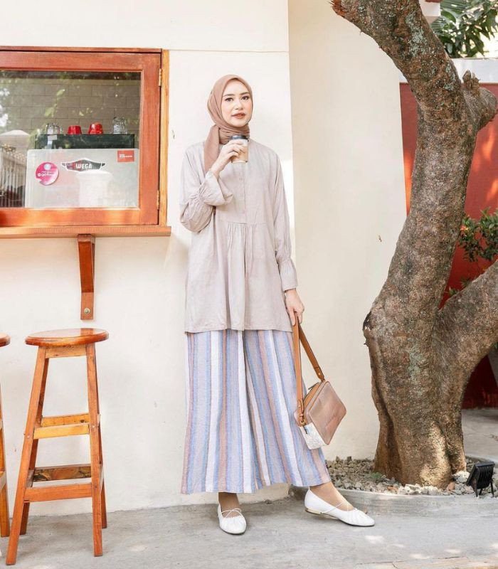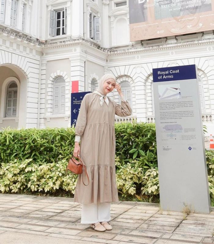 11. Perpaduan midi dress berwarna coksu dengan celana kulot jeans putih serta hijab pashmina berwarna soft beige, ia menambahkan scarf motif di bagian leher sebagai pemanis outfit-nya agar tidak tampak monoton. Tambahkan hand bag dan mule shoes berwarna senada dengan outfit agar terlihat matching!