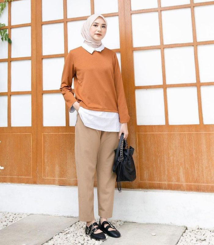 10. Tampil dengan outfit yang stylish, cocok juga dikenakan untuk daily office look. Pilih kemeja lengan panjang berwarna putih dibalut blouse berwarna orange dengan straight pants berwarna coksu serta hijab segi empat berwarna sand beige. Lengkapi outfit dengan hand bag dan flat shoes berwarna hitam senada.