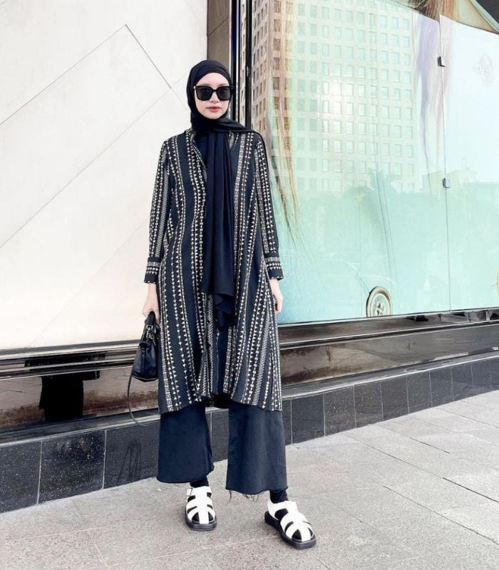 12. Terakhir, mengusung konsep ala mamba style dengan nuansa warna gelap. Bahjatina menggabungkan tunik bermotif dengan cullote jeans serta hiijab pashmina berwarna serba hitam. Ia pun mengenakan sunglasses dan hand bag warna hitam senada serta sandals putih, bikin look-nya makin kece maksimal!