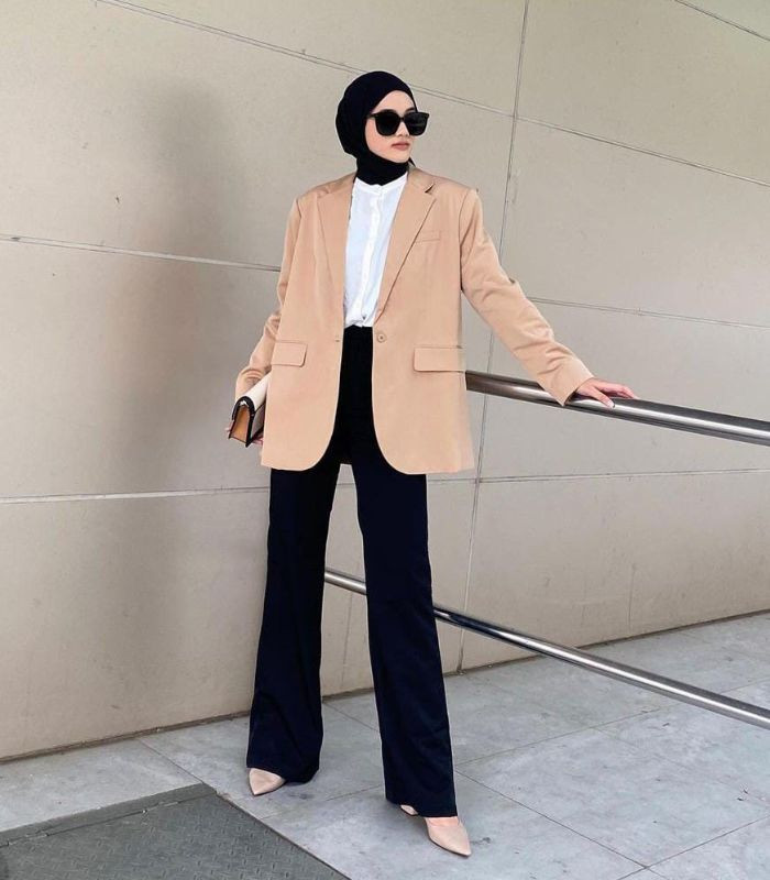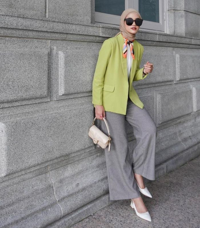 10. Tampil fresh look yang terkesan beda nan unik ini! Padukan blouse putih sebagai dalamannya dibalut blazer warna lime green dengan celana kulot berwarna abu-abu dipadankan dengan hijab segi empat berwarna coksu serta scarf warna orange pada bagian leher sebagai pemanis outfit-nya, tambahkan hand bag dan block heels andalan, bikin look-mu makin all out!