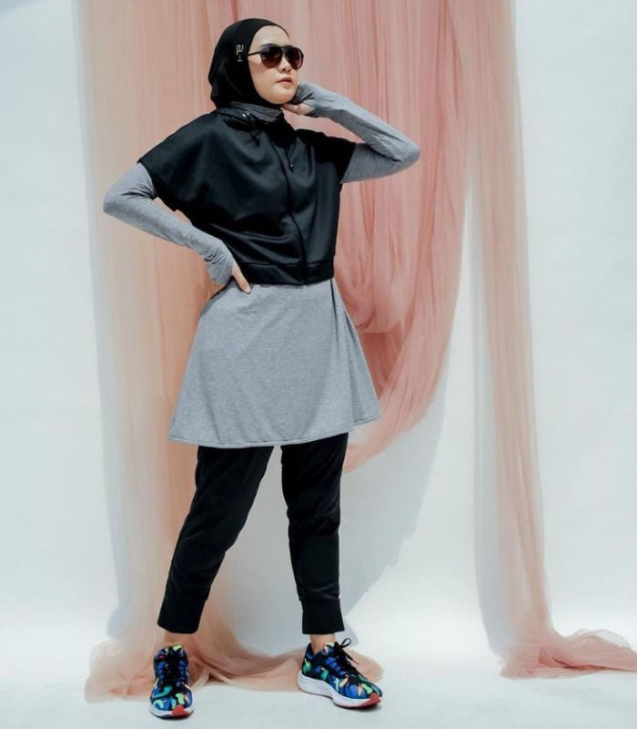 2. Pilih long sleeve t-shirt warna abu-abu dibalut vest dan hijab khusus sporty serta slim fit pants berwarna hitam yang senada, tambahkan sunglasses dan sneakers andalanmu, agar look-mu makin standout!
