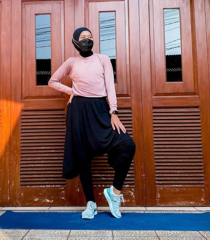 3. Tampil feminin look yang terkesan santun. Lulu menggabungkan setelan busana sporty long sleeve t-shirt warna pink dengan rok celana berwarna hitam yang senada dengan hijab. Tampil kece walaupun olahraga di depan rumah.