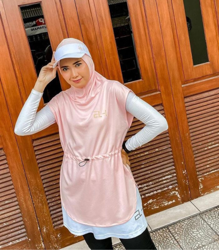 4. Gaya satu ini cukup kekinian yang tampil modis! Lulu memadukan setelan busana sporty long sleeve t-shirt dibalut vest warna pink dengan model menyatu dengan hijab yang anti-ribet kemudian dipadukan dengan slim fit pants hitam. Ia menggunakan visor cap warna putih agar penampilannya makin terlihat all out!
