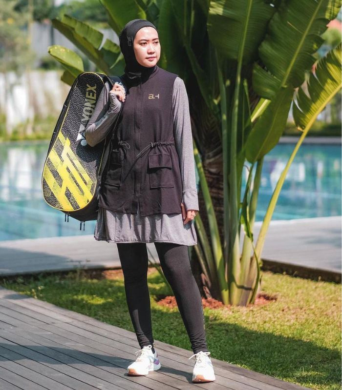 9. Terakhir, Lulu menggabungkan setelan busana sporty long sleeve t-shirt berwarna abu-abu dibalut dengan vest yang menyatu dengan hijab berwarna hitam senada dengan celana legging. Tak lupa ia menggunakan sneakers putih agar penampilannya makin all out!