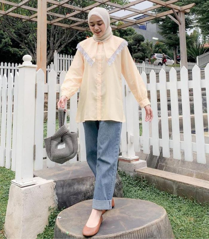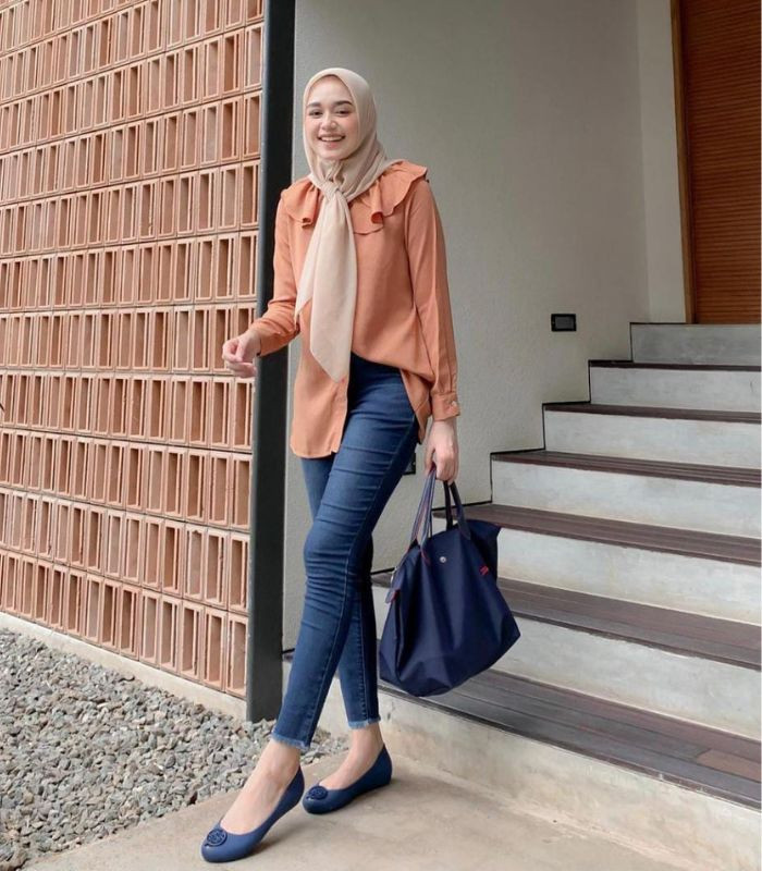 5. Terkesan simple namun tetap terlihat effortless yang nyaman! Nazlia memadukan kemeja berwarna coral dengan slim fit jeans dan hijab segi empat berwarna soft beige, tambahkan hand bag dan flat shoes berwarna navy yang senada bikin look-mu tampak matching!