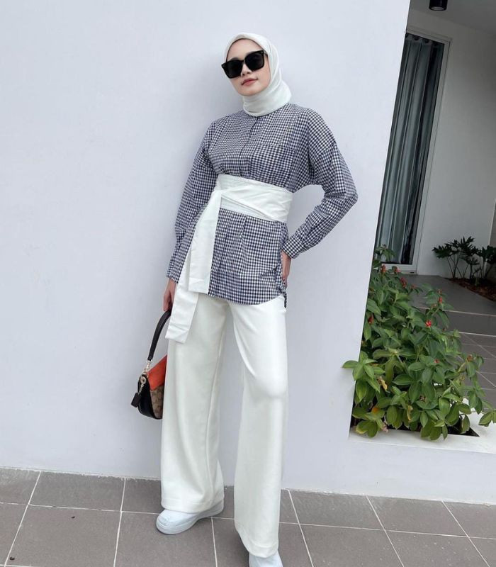 3. Pecinta gaya monokrom pasti suka dengan outfit ini! Padukan kemeja gingham warna navy dibalut obi belt berwarna putih senada dengan hijab segi empat dan high waist loose pants, biar makin stand out tambahkan sunglasses, sepatu kets putih dan hand bag andalanmu!