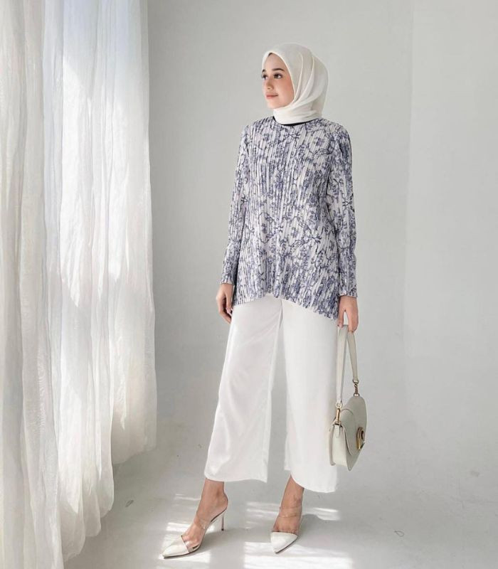 4. Gunakan tunik warna navy berpotongan asimetris dengan pants berwarna putih senada dengan hijab segi empat, buat tampilanmu makin stunning, tambahkan heels dan hand bag yang senada!