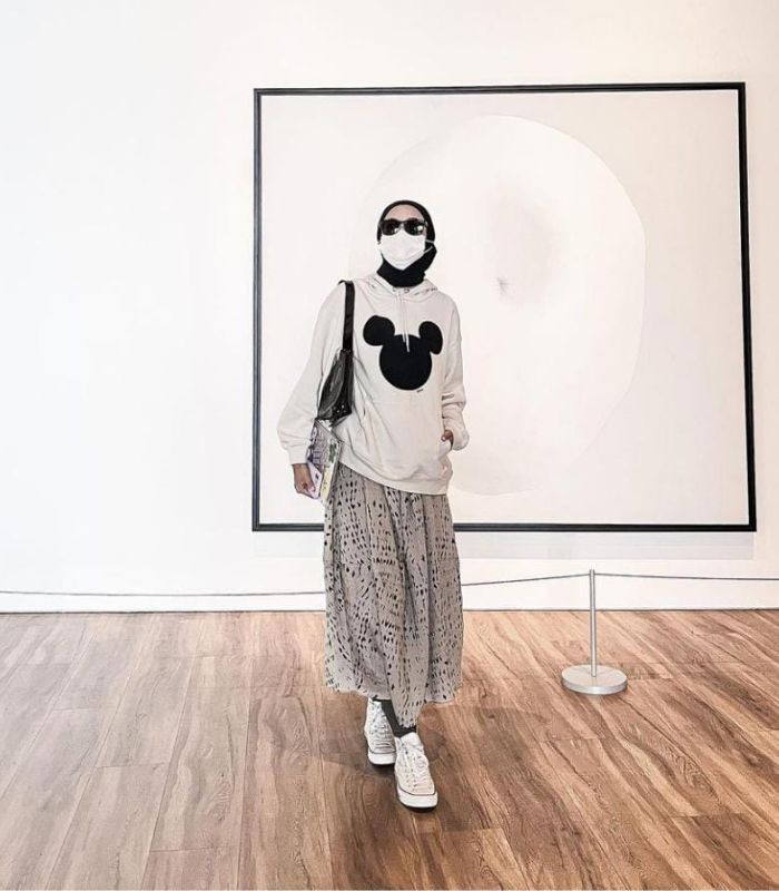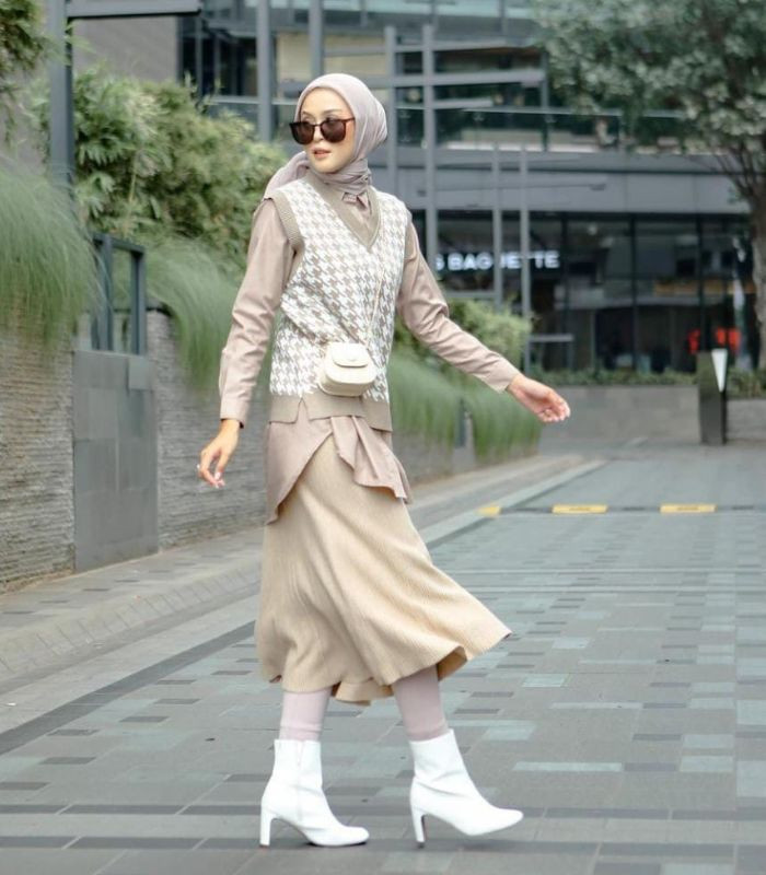 7. Penampilan yang memberikan kesan nude yang manis. Pilih long sleeve shirt berwarna latte dibalut knit gingham vest top dipadukan dengan maxi skirt berwarna cream berpotongan 3/4 menutupi bagian legging serta tak lupa kenakan hijab segi empat berwarna light grey. Tambahkan sunglasses, sling bag dan ankle boot warna putih senada bikin outfit-mu makin stand out!