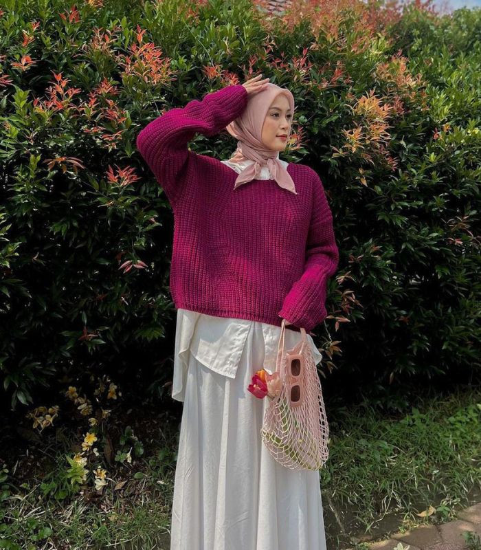 6. Tampil feminin look yang terkesan eye catching. Padukan oversized shirt berwarna putih yang senada dengan maxi skirt dibalut oversized knit sweater berwarna magenta serta hijab segi empat berwarna dusty pink.