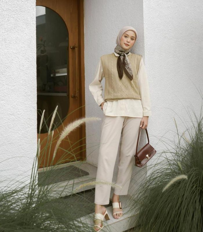 8. Outfit casual namun tetap terlihat modis kekinian. Pilih kemeja lengan panjang berwarna cream dibalut knit vest top berwarna sand dipadukan dengan straight pants berwarna ivory serta hijab segi empat berwarna rosey brown, tak lupa ia menambahkan scarf motif pada bagian leher sebagai pemanis outfit-nya yang bikin tampilannya makin stand out!