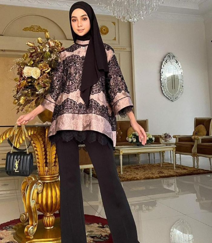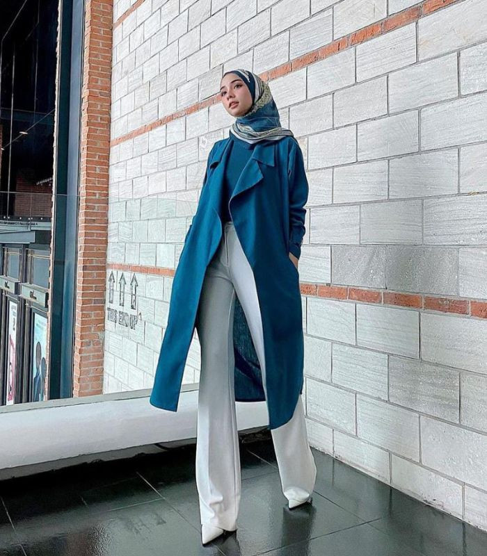11. Tampil stylish kekinian yang memberikan kesan stunning! Nesa memadukan inner dibalut outer berwarna royal blue yang senada dipadankan dengan high waist loose jeans putih, ia memilih hijab pashmina warna biru bermotif, tambahkan high heels putih agar look-mu makin all out!
