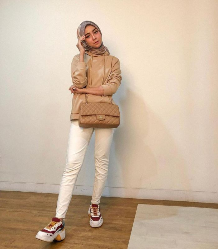 10. Padukan hoodie berwarna coksu dengan slim fit jeans putih serta hijab segi empat printing agar penampilannya tidak terlihat monoton, lengkapi dengan sling bag dan sneakers andalanmu agar penampilan makin terlihat stand out!