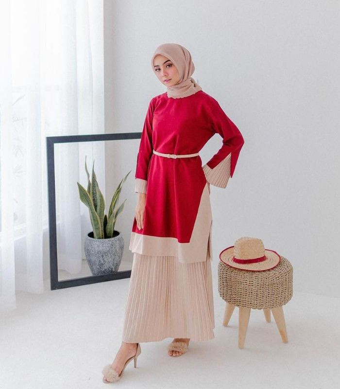 12. Terakhir, tampil dengan kesan anggun yang menawan! Nesa menggabungkan tunik merah beraksen belt minimalis pada pinggang dengan rok plisket berwarna nude pink serta hijab segi empat berwarna dusty pink, ia pun mengenakan high heels warna nude yang tampak matching dengan outfit-nya.