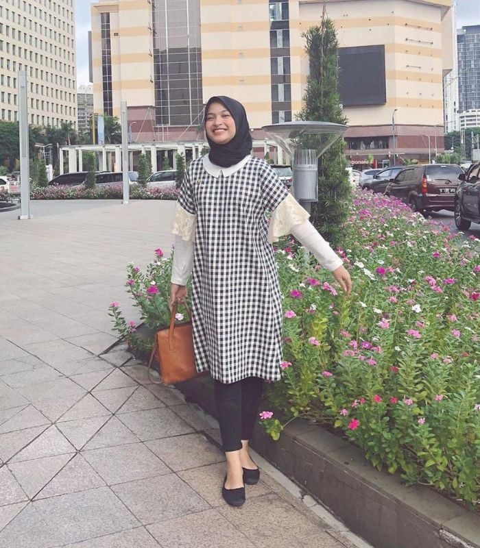 2. Tampil dengan gaya monokrom yang terkesan chic. Padukan manset putih dibalut tunik berlengan pendek motif kotak-kotak dengan slim fit jeans warna hitam yang senada dengan hijab segi empat. Lengkapi dengan hand bag dan flat shoes andalan biar look-mu makin all out!