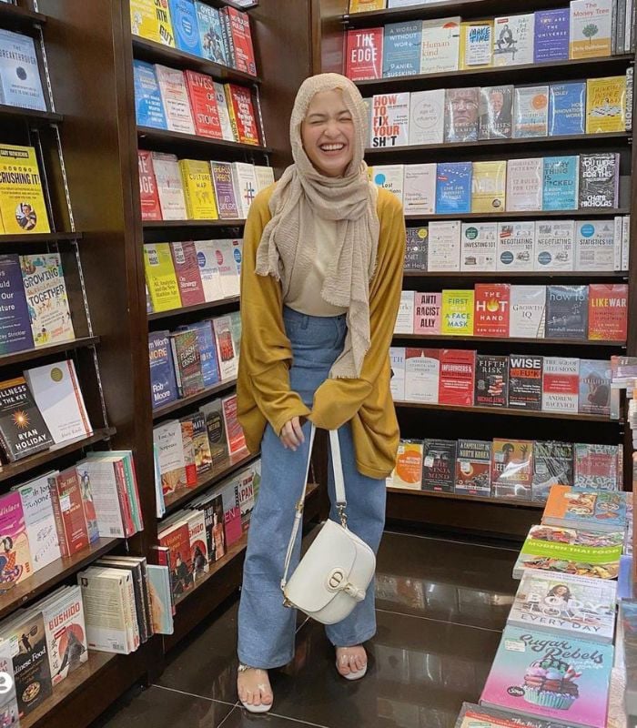 3. Penampilan dengan gaya casual yang nyaman! Muthia memilih inner berwarna cream yang senada dengan hijab pashmina dibalutĀ oversized outer cardigan berwarna kuning mustard dipadukan dengan high waist loose jeans, ia pun menambahkan hand bag dan block heels berwarna putih senada yang tampak matching!