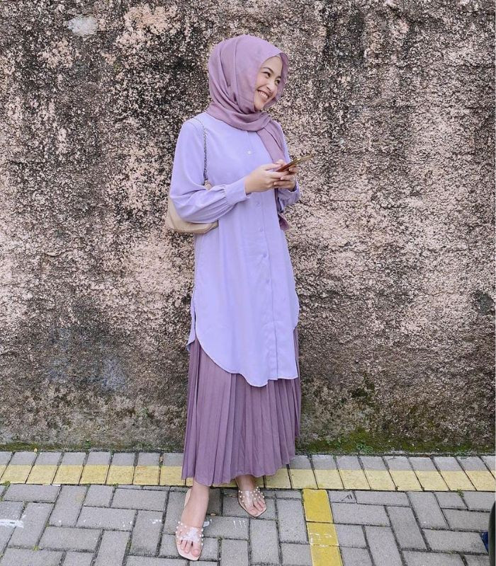 4. Tampil feminin look yang memberikan kesan anggun! Kombinasikan tunik berwarna baby blue dengan rok plisket berwarna ungu yang senada dengan hijab pashmina, salah satu perpaduan warna yang tampak serasi.