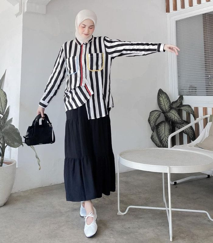 9. Gunakan stripe shirt dengan ruffle skirt berwarna hitam senada dipadukan dengan hijab segi empat berwarna sand beige, apalagi ditambah pumps flat shoes putih dan hand bag hitam bikin gayamu makin stand out!