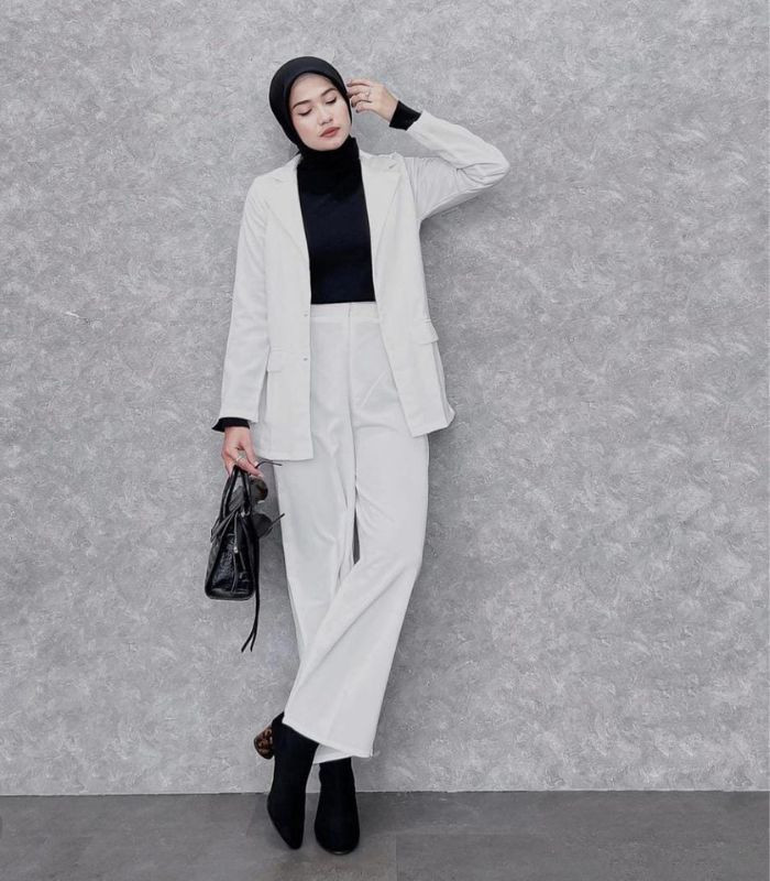 10. Tampil elegan dengan nuansa monochrome style. Padukan long sleeve t-shirt hitam yang senada dengan hijab segi empat dibalut setelan blazer dan celana bahan warna putih senada. Buat look outfit-mu makin terlihat all out, gunakan chelsea boots dan hand bag berwarna hitam senada.