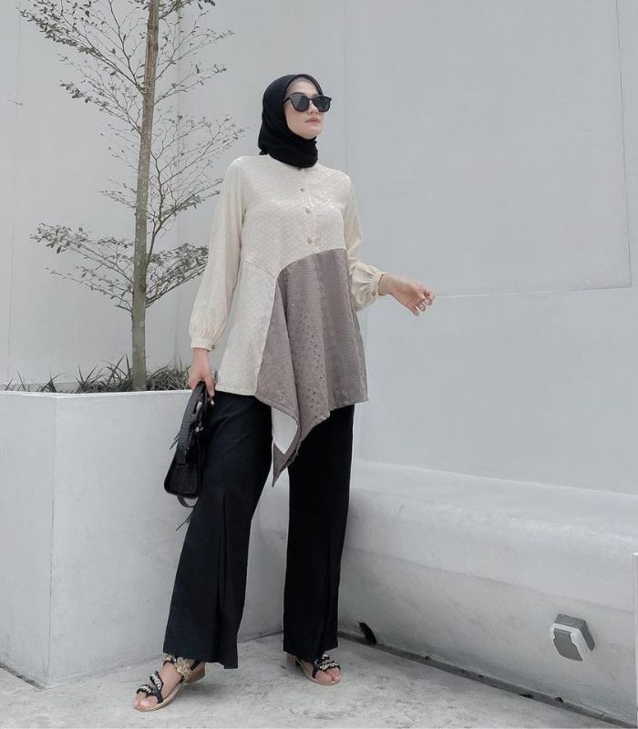 11. Terakhir, Anggita menggabungkan tunik berpotongan asimetris dengan celana kulot berwarna hitam yang senada dengan hijab segi empat, tambahkan sunglasses, hand bag dan sandals berwarna hitam senada. Bikin look-mu makin terkesan modis yang kece!
